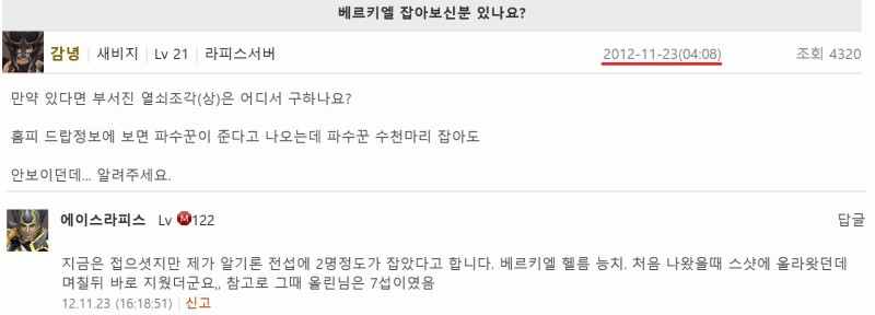 홈페이지 글을 발췌해보니 2012년 11월당시, 전섭에서 최초로 베르키엘을 잡았다는 글이 있는것 처럼 베르 자체는 출시한지 약 3-4년 가까이 지나서야 정복됬을정도로 악명높은 보스입니다.