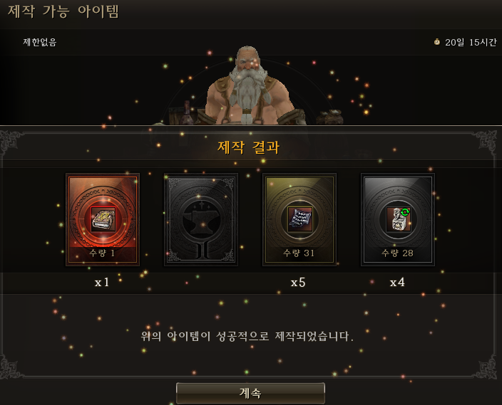 게이지가 모두 채워지면 제작된 아이템을 확인 및 획득할 수 있다.