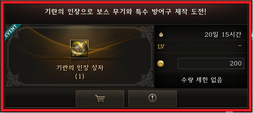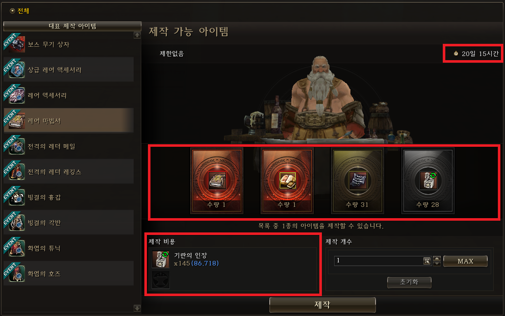 이벤트 혹은 특정 아이템 제작의 경우 우측 상단에 제작 가능한 기간이 표기되니 꼭 확인하자.