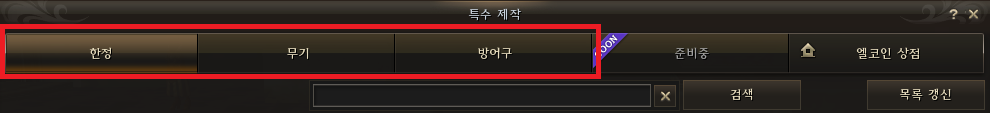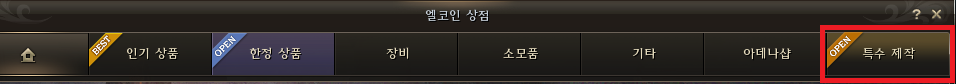 특수 제작은 엘코인 상점 오른쪽의 특수 제작 탭을 클릭하여 이용할 수 있다.