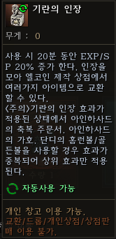 기란의 인장은 특수 제작을 통해 소모할 수 있지만 직접 사용할 경우 EXP/SP를 추가 획득하는 버프 아이템으로도 사용할 수 있다.