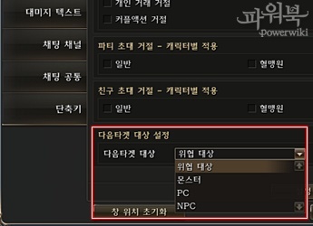 환경 설정 게임플레이 탭에서 다음타겟 대상을 설정할 수 있다