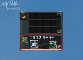 자동 타겟 우측에는 자동으로 사용하고자 하는 매크로 1개를 등록할 수 있다. 해당 숏컷 창에는 매크로만 등록이 가능하고, 액션 또는 스킬, 소모품은 등록할 수 없다. 자동 타겟 창 좌측의 자동사용 모두 켜기/끄기 버튼을 활용하면 자동 타겟과 매크로를 동시에 활성화 할 수 있다.