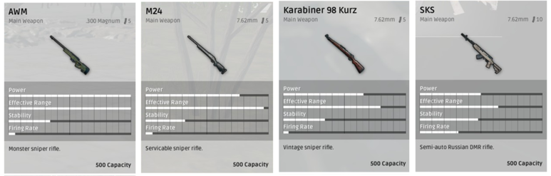 - AWM은 에어드롭을 통해서만 획득이 가능하고 저격총 중 유일하게 0.300 매그넘 탄환을 사용합니다. 이 탄환조차 에어드롭을 통해서만 구할 수 있기 때문에 탄환 낭비는 금물입니다. 다만 그만큼 성능은 굉장합니다. 유효 사거리 최강, 대미지 최강.... 일단 맞으면 반샷나지 않는 한은 죽어야 합니다. 정말로... 무시무시한 총이죠;;