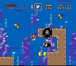 저 해골마크의 2*2사이즈 블록의 아래쪽에서 나와서 마리오에게 쏘아지지만