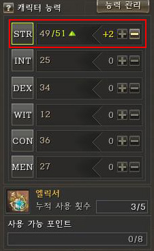엘릭서 아이템 더블 클릭시, 능력 관리 포인트가 +1 증가한다. 추가된 포인트로 기본 능력(Stat) 우측의 +아이콘을 클릭하여 STR/INT/DEX/WIT/CON/MEN 중 원하는능력치를 영구적으로 강화할 수 있다. 강화할 기본 능력 선택 시 상승 전 수치와 상승 후 수치가 함께 보여지며, 강화가 완료된 능력치는 테두리가 표시되어 직관적으로 확인할 수 있다.