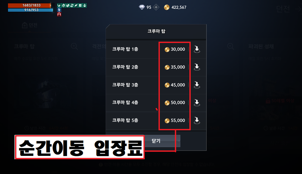 30레벨찍은 상태에서 크루마탑 여러번 입장식 계속해서 3만골드가 빠져나갑니다. 주의하세요.