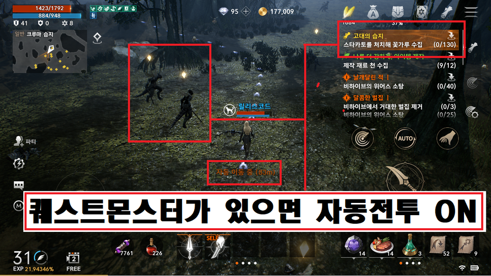 5. 퀘스트몬스터가 주변에 있다면 자동전투 ON을 하십시오.