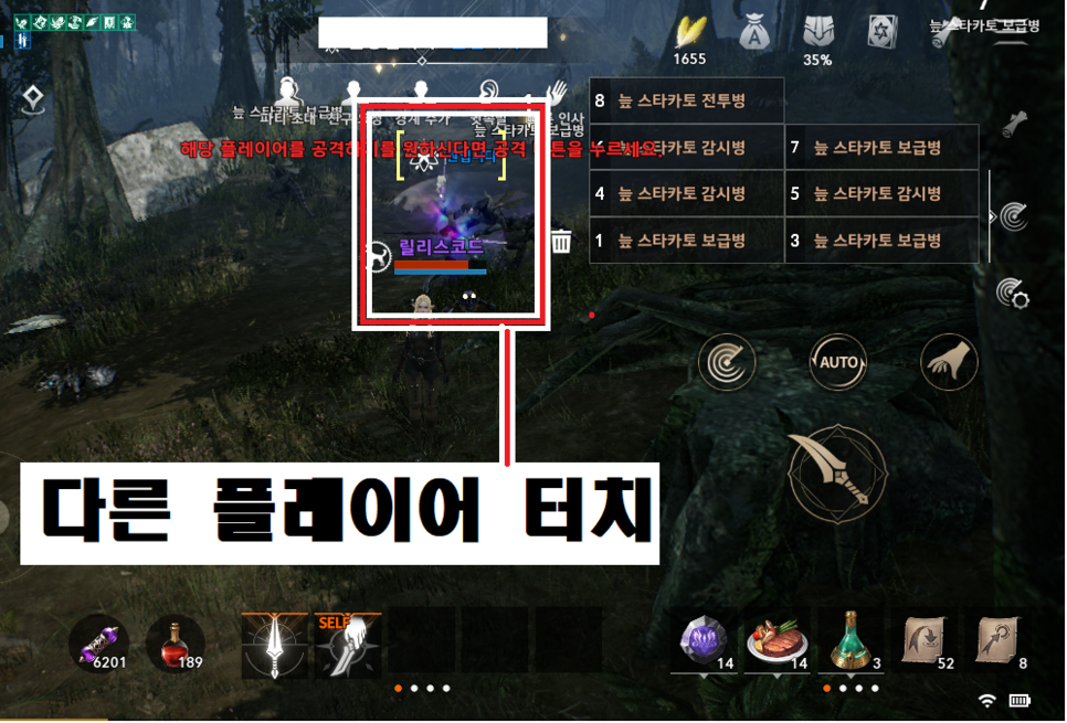 필드에 보이는 다른 캐릭터를 터치하면 안내 문구가 붉은색으로 표시됩니다.