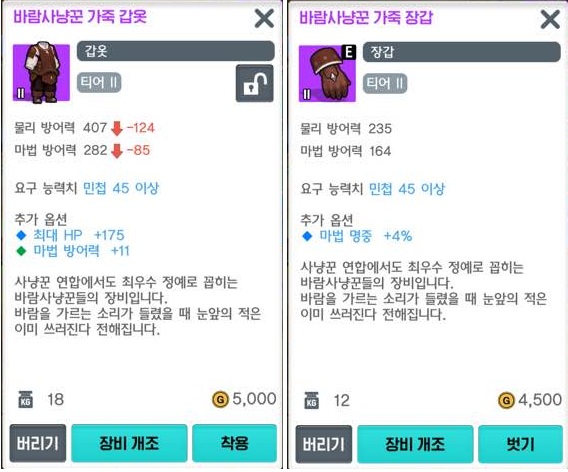 └ 획득한 아이템은 요구 능력치에 따라 장착가능/장착불가능이 나눠지므로 사냥으로 아이템을 획득하기에는 효율성이 너무 낮습니다.