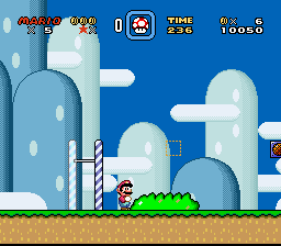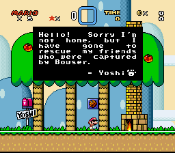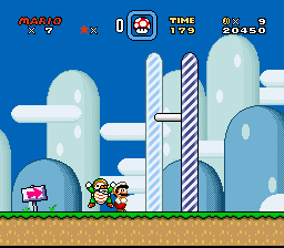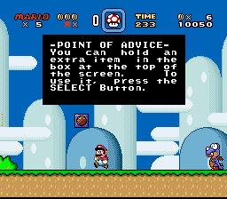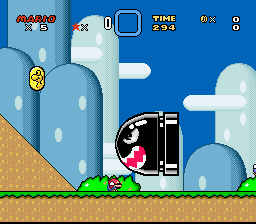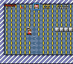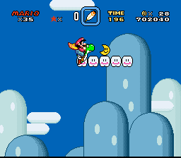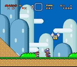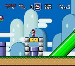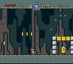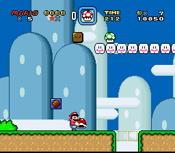 난쟁이를 벗어나 2칸 크기 마리오가 되면 위의 노란 블록을 스핀점프로 위에서 부술 수 있다. 노란 블록은 스핀블록이라 부르겠지만 본명은 '턴 블록'이던가? 그건 아래에서 치면 빙빙 돌아가기 때문이다.