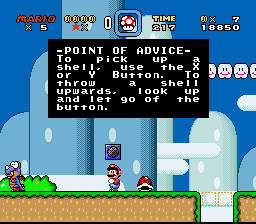 쿠파 쉘을 잡고(A키) ↑ 키를 누르면서 A 키를 또 누르면 쿠파 쉘이 위로 높이 던져지며(?) 스핀블록을 건드려 1UP 버섯이 나온다. 그 외에는 잡은 채로 그냥 A 키를 누르면 앞에 놓여지고, ↓ + A 키를 누르면 슬며시 앞에 내려놓게 되는 등... 잡고 놓기에도 많은 방법이 있다. 쉘뿐만 아니라 다른 잡는 것(스프링, POW, 열쇠, 베이비 요시, 던지는 블록 등)도 이 방법이 가능하다.