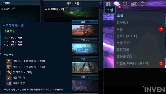 이외에도 파트너 모험 UI의 모험 필드 또는 시작 버튼에 마우스 오버 시 모험 조건과 보상등의 세부적인 정보를 확인할 수 있는 툴팁과 메인 메뉴에 파트너 모험 완료 표시가 추가되었다.