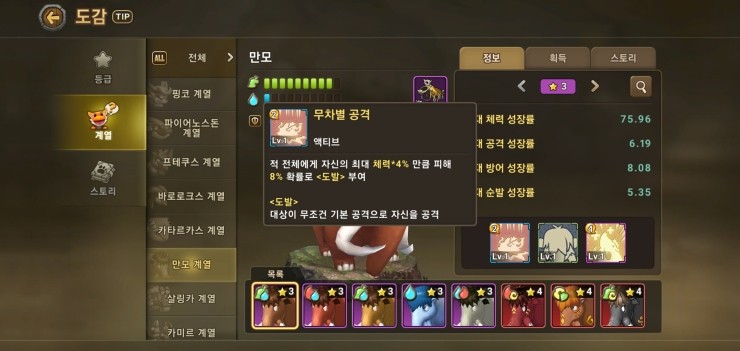 이 전체 공격 스킬이 쉬운몹들을 빠르고 쉽게 잡을수 있기때문에 만모 먼저 키우기도 한다.