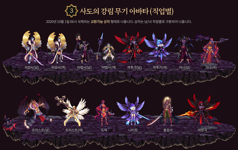 각각 0.5%의 확률로 등장하게되는 무기아바타상자. 교환가능이며, 모든 직업을 합치면 7%의 확률로 등장한다.