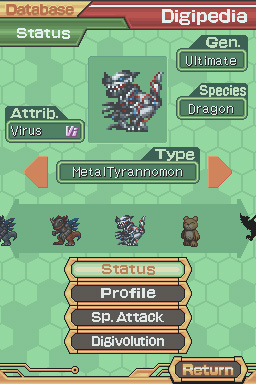 티라노몬에서 배틀 8번이상,기계속성 40이상을 올려서 메탈티라노몬으로 진화합니다..