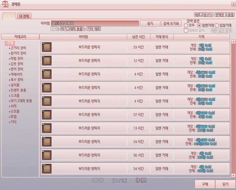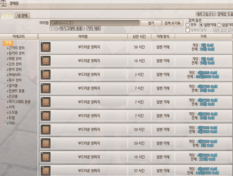 부드러운 양피지가 잘 안 팔린다면 [필기구 크래프트] 스킬을 통해 마법의 양피지로 변환해서 파셔도 됩니다.