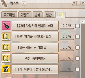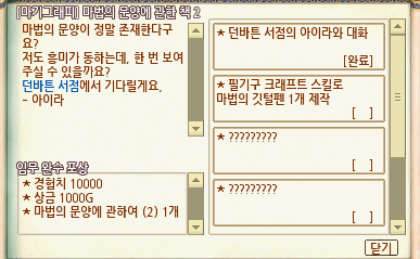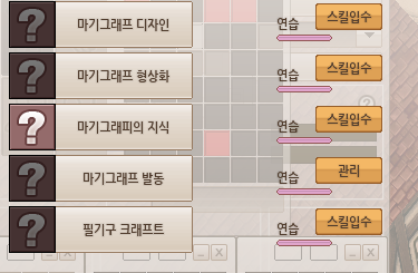 2. [마법의 문양에 관한 책] 퀘스트 : 던바트 서점 아이라 말을 걸면 [마법의 문양에 관한 책-1]을 받습니다. 해당 책을 읽은 뒤 마기그래프 형상화,마기그래피의 지식,마기그래프 발동,필기구 크래프트 스킬 입수 클릭. 마기그래피 발동 스킬은 관리 탭에 들어가셔서 스킬 입수 버튼을 누르면 됩니다.
