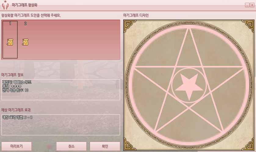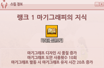 디자인부터 발동까지, 마기그래피 전반에 대한 지식.마기그래프를 디자인 할 때 도안의 품질 및 사용 횟수, 형상화가 완료된 마기그래프를 발동할 때 효과 유지 시간에 영향을 준다. 1랭크 기준 마기그래프 도안 사용횟수 10회, 마기그래프 발동 시 마기그래프 유지 시간 20초 증가. 사람이나 책으로부터 더 나은 방법 습득 가능