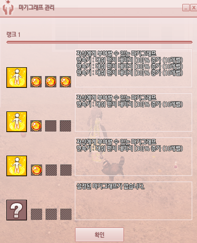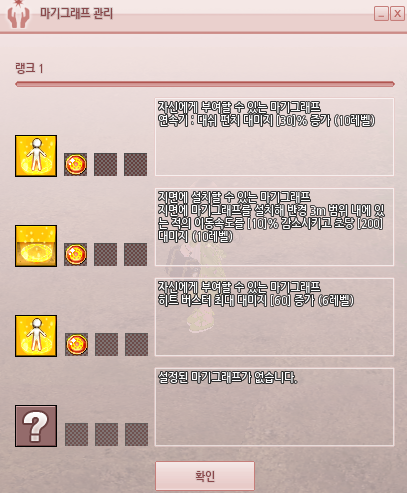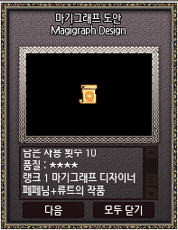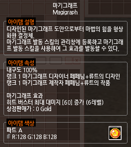 연속기 : 대쉬펀치 대미지[30]%증가(10레벨) 마기그래피 3개를 겹쳐서 사용할 경우 효과가 중첩되진 않고 "마기그래프 발동" 스킬 수련항목 중 [3가지 마기그래프로 구성된 세트를 발동한다], [마기그래프를 발동한다], [자신or지면을 대상으로 하는 마기그래프를 발동한다] 항목이 수련되는걸로 확인되었습니다(수련용)