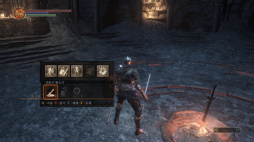 아이템은 "귀환의 뼛조각" 제사장 또는 마지막 화톳불로 이동할 수 있는 아이템 입니다.
