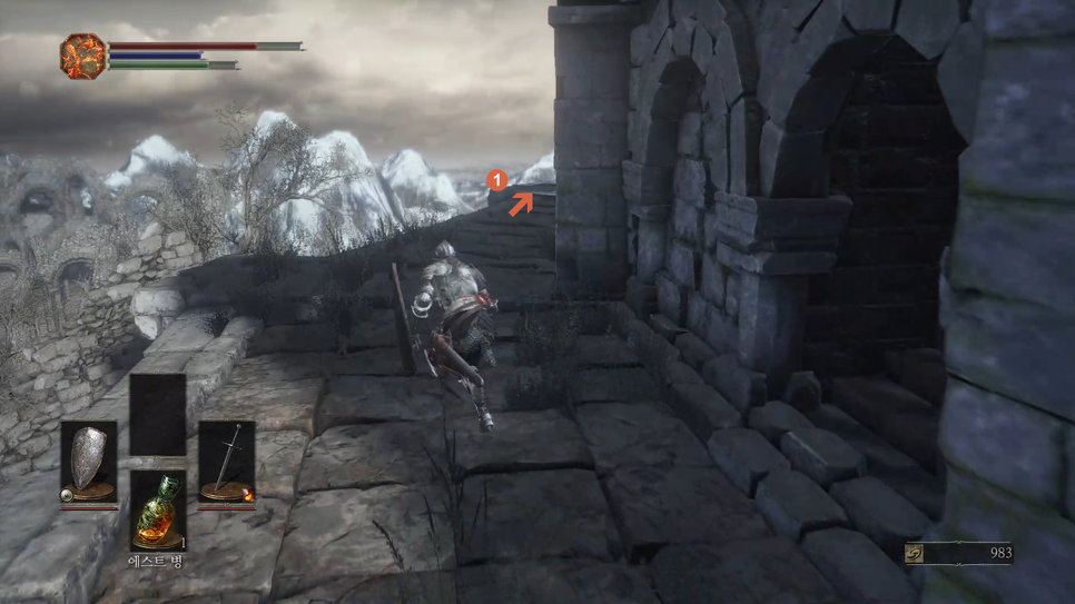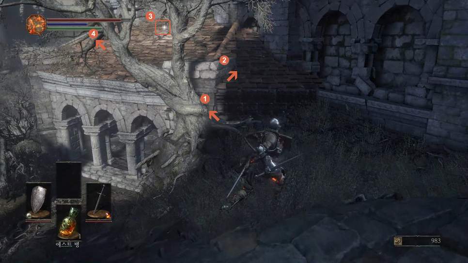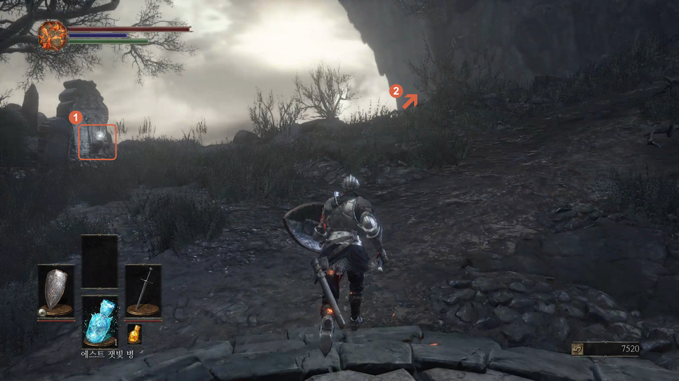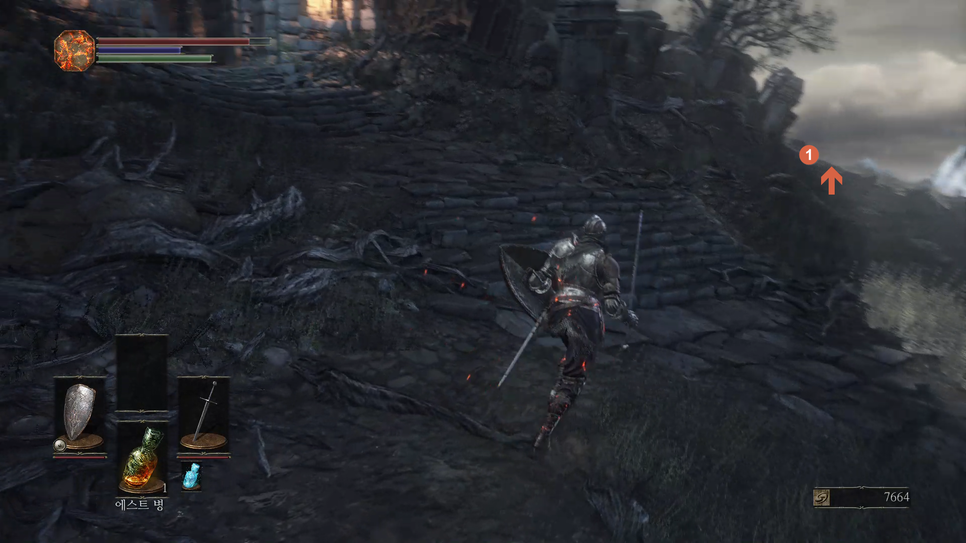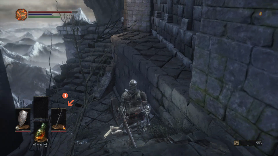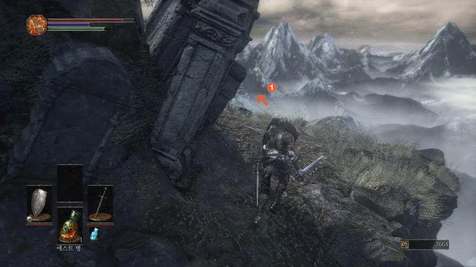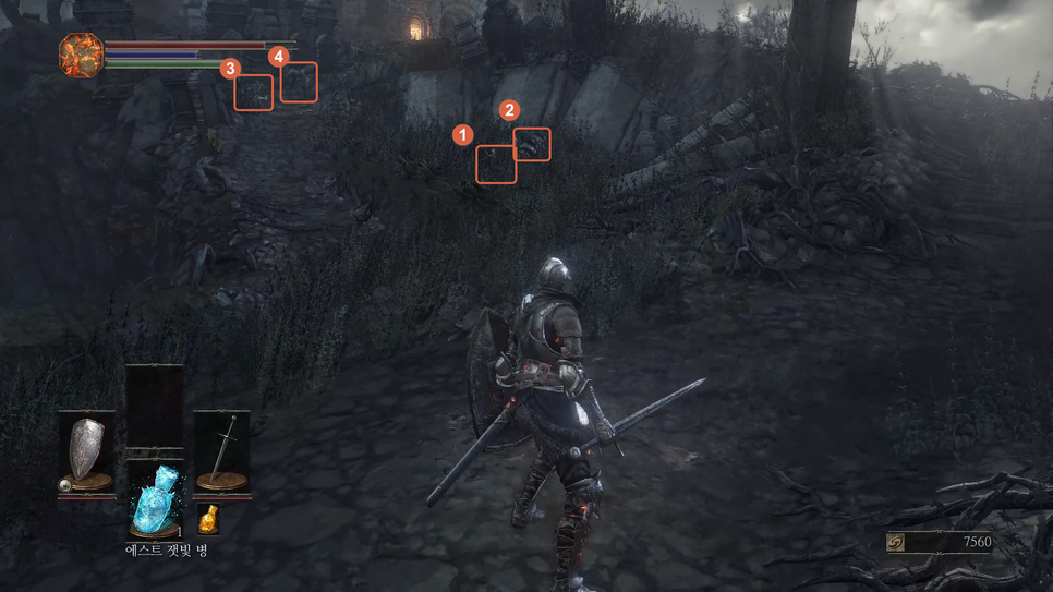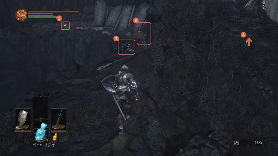 절벽쪽 길로 들어가 몹을 처리하고 아이템을 획득한뒤 4번 길로 올라갑니다.