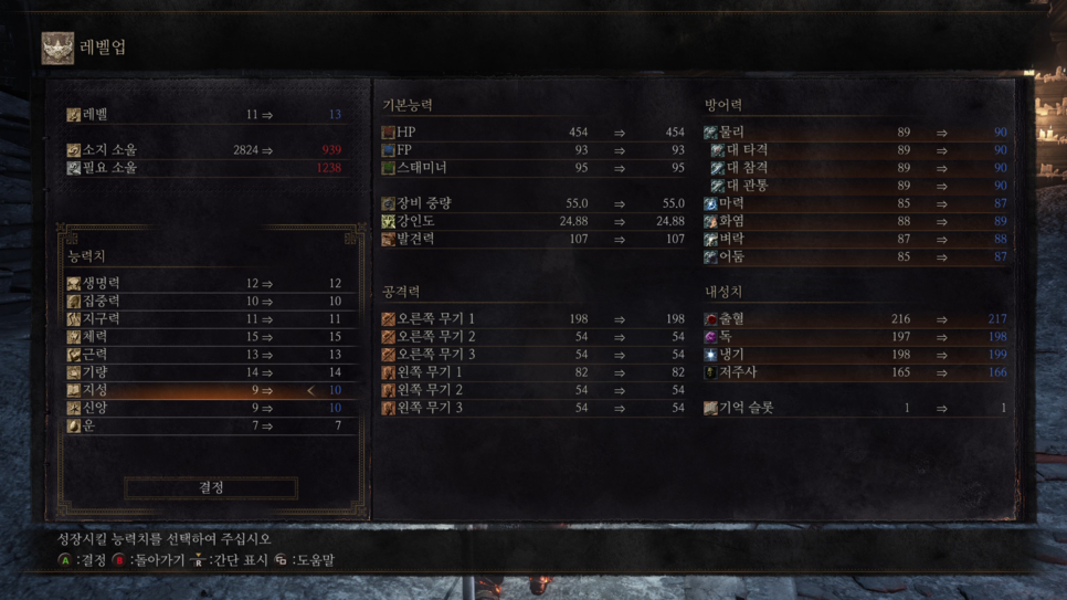 그 다음 응급치료 사용과 추후 이벤트를 위한 지성/신앙 스탯을 10으로 맞춰줍니다.