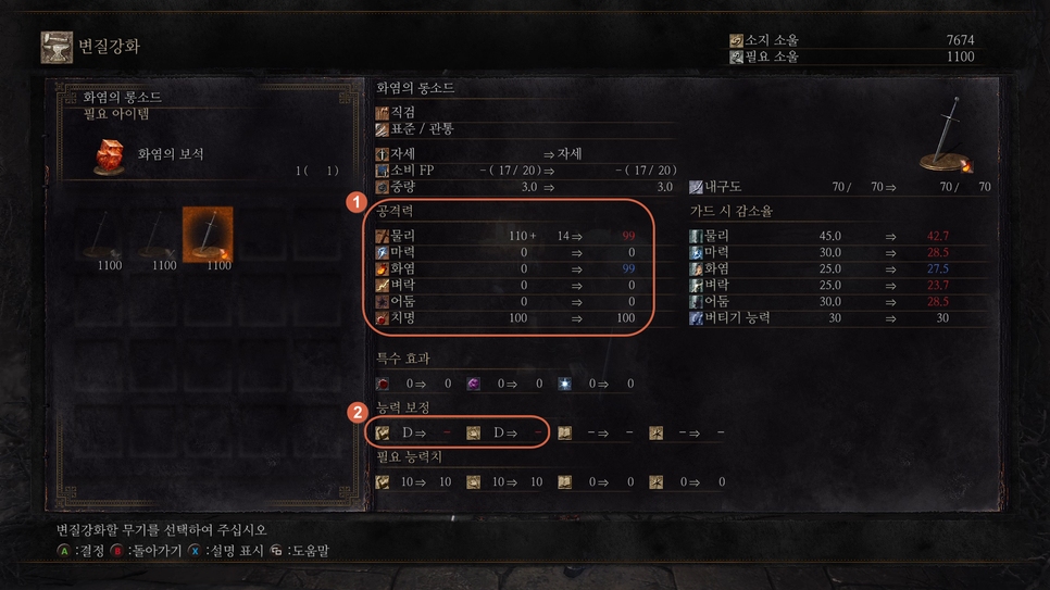 화염 변질을 하게되면 무기에 화염데미지가 추가되고, 스탯 보정에 의한 공격력 상승이 사라집니다.