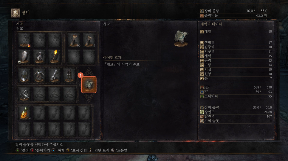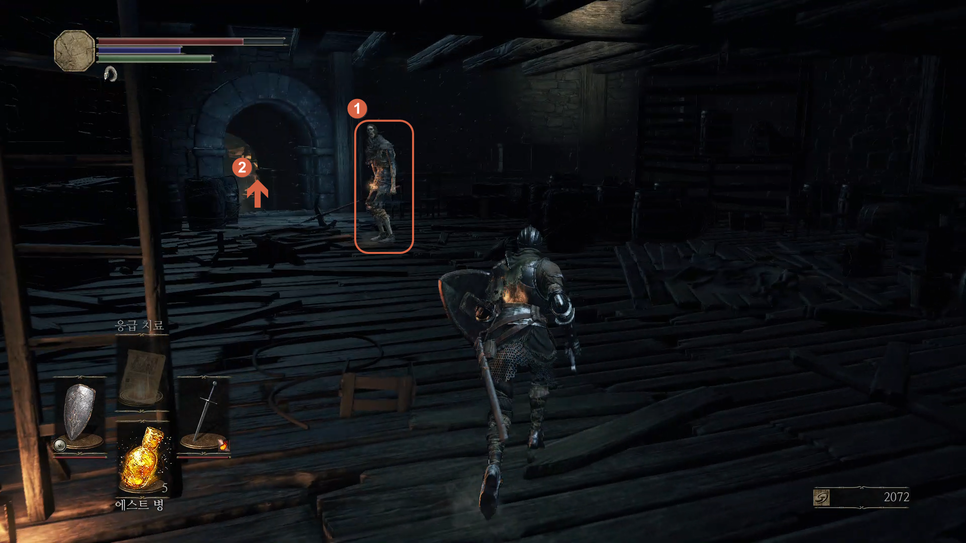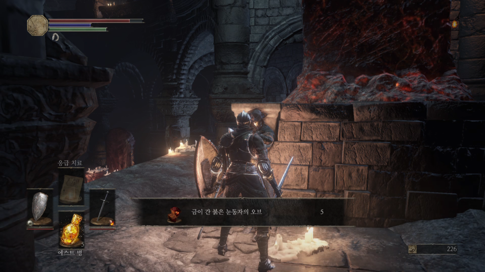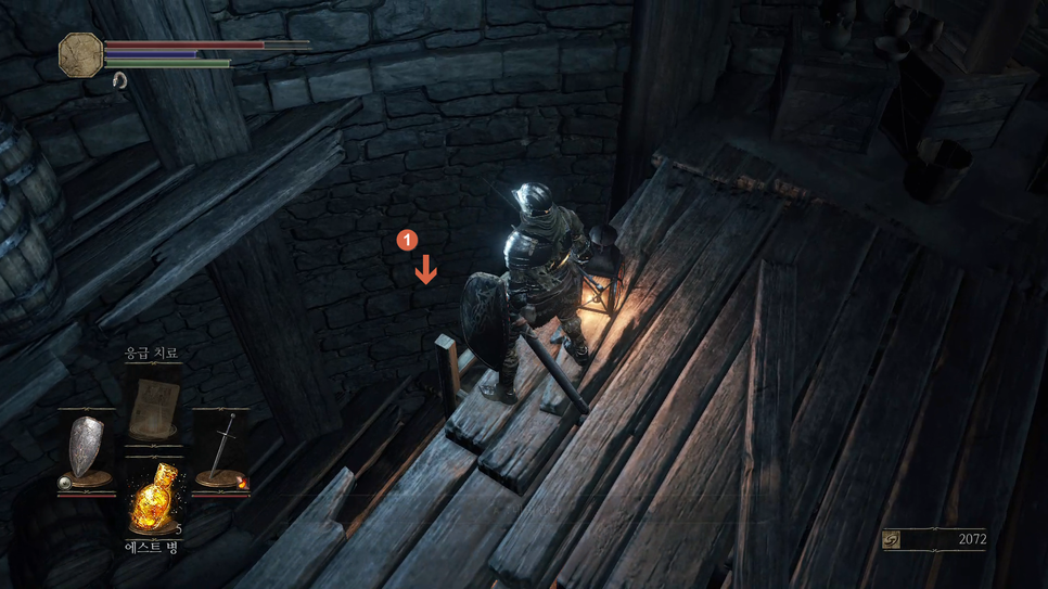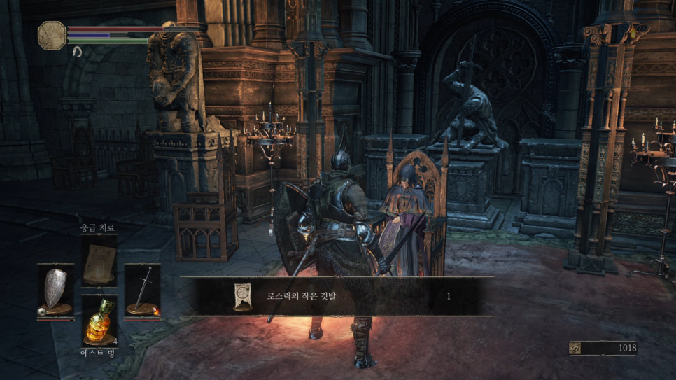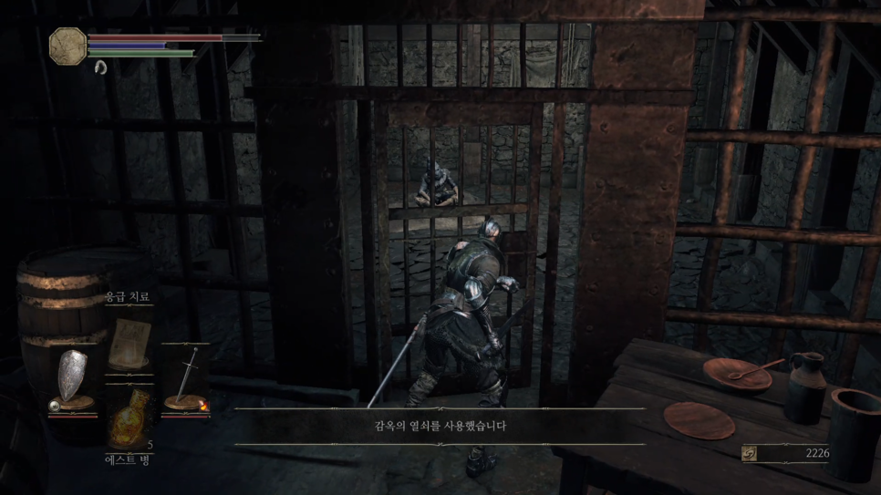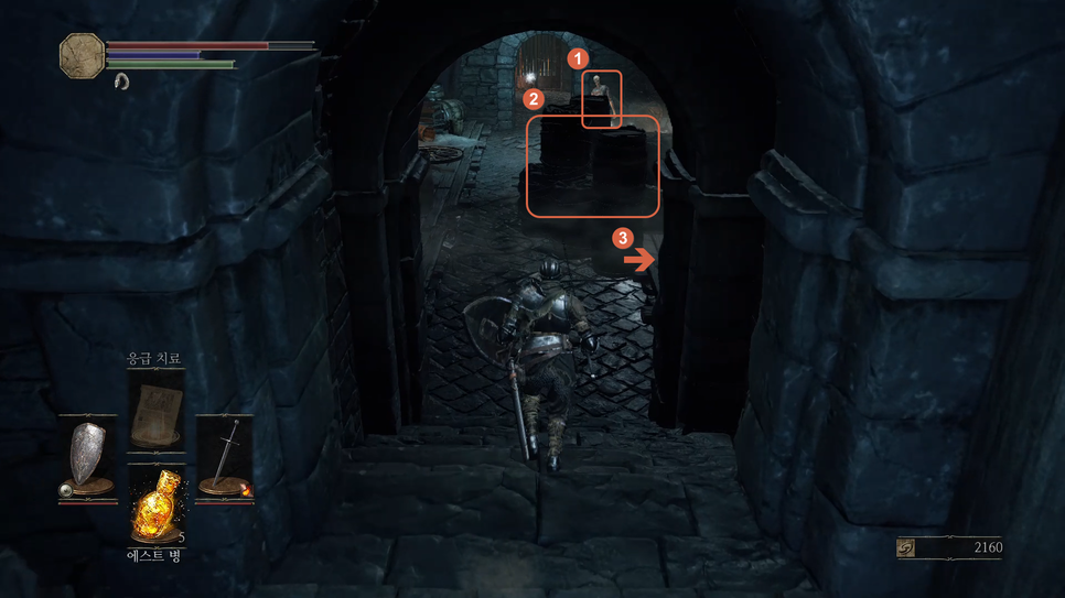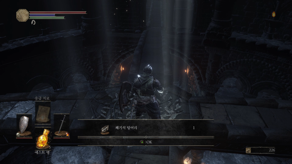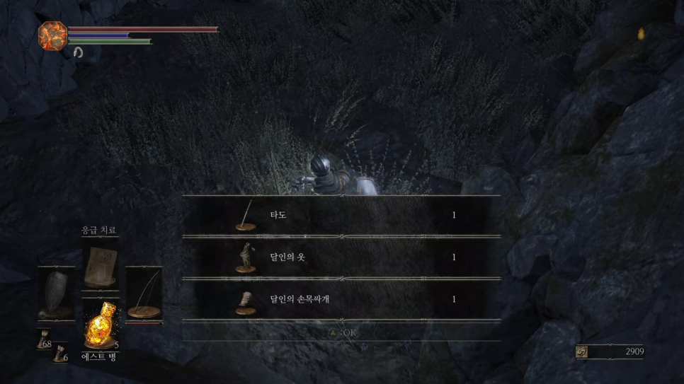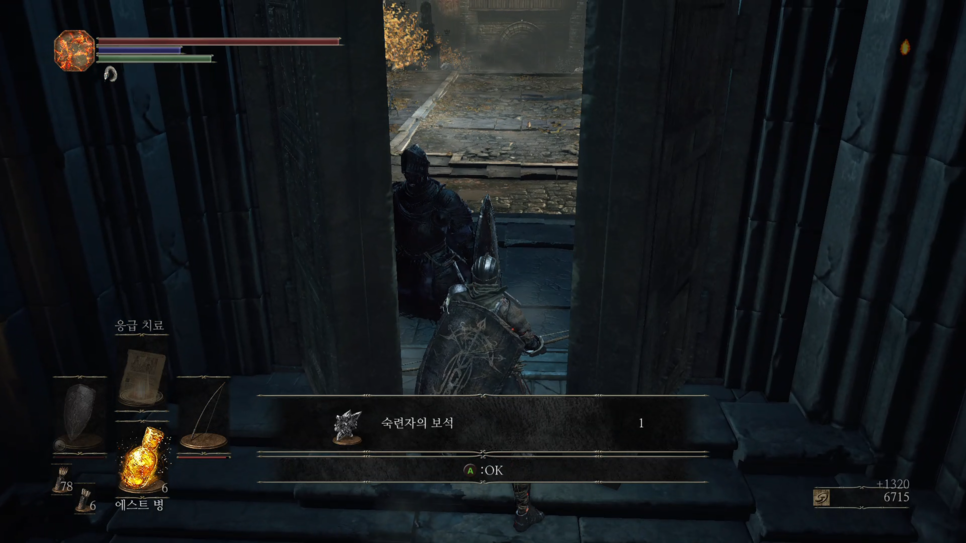 이전에 얻은 "에스트 파편"으로 대장장이에게 가서 에스트 병 강화를 해줍시다.