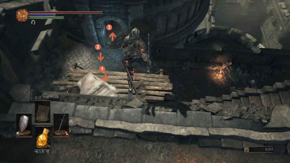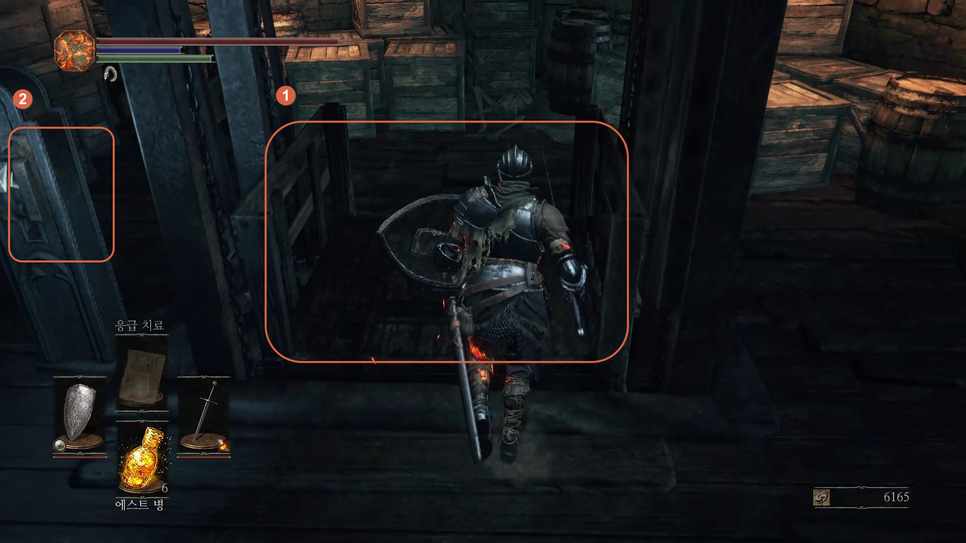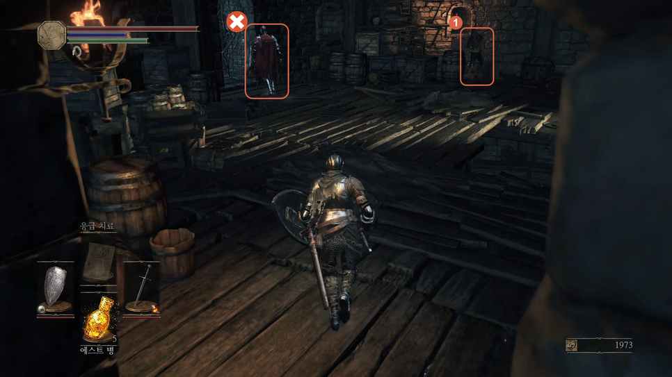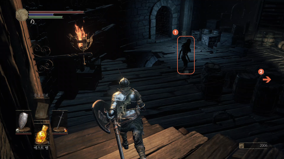화염의 롱소드로 기름통을 공격하지 않게 조심합시다. (구르기로 부시는건 괜찮습니다)