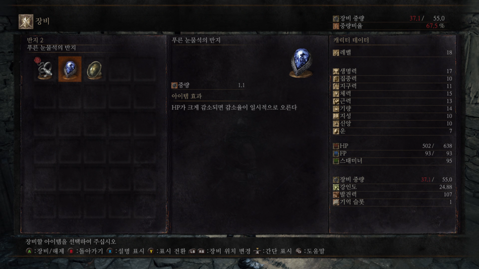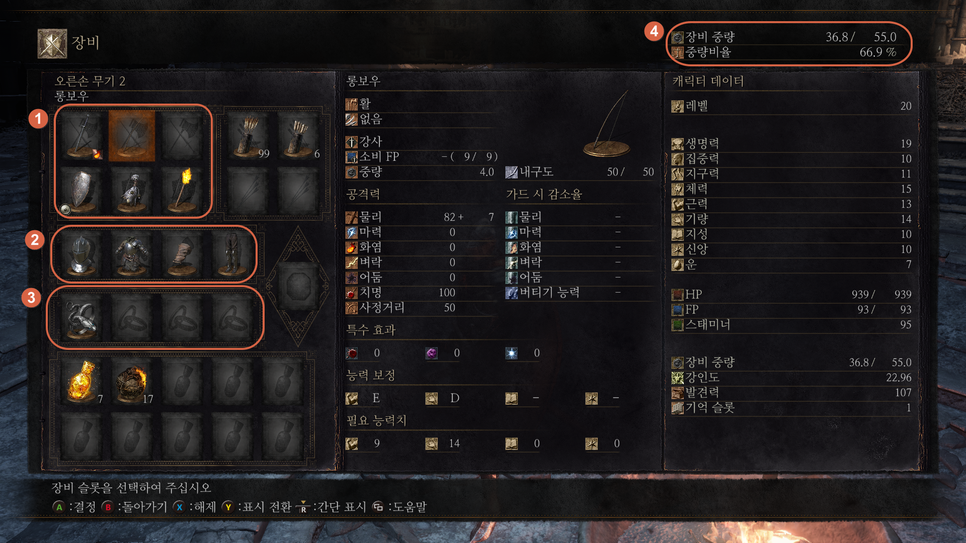 중량비율을 위해서 "달인의 손목싸개"를 장착하고 오른손 무기2에 "롱보우"를 장착해줍니다.
