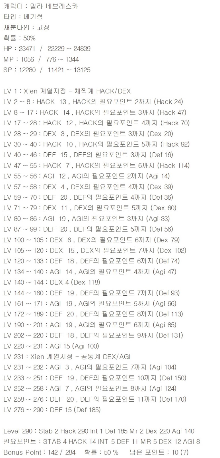 이셀다의 경우 레벨구간마다 네냐플 포인트 소모량이 틀리며